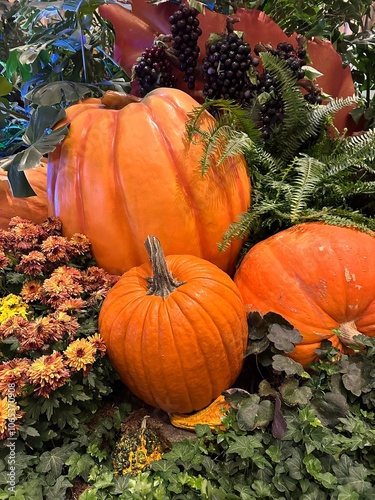© Gerri, Obraz premium Autumn themed garden area with pumpkins and fall flowers