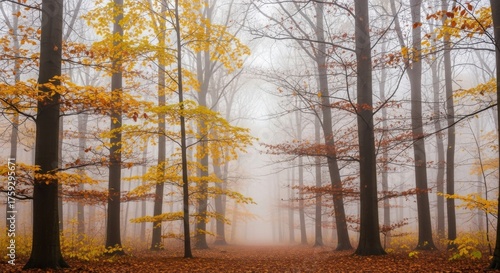 © Ophelia, Fototapeta premium Autumn to winter transition in misty forest pathway scene for seasonal design and decor