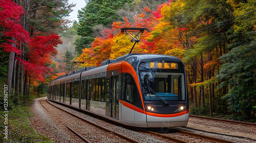 Naklejka premium Autumn train journey through vibrant forest. Travel, nature, scenic, transport, foliage