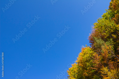 © Milen, Fototapeta premium Autumn tree leaves on blue background, copy space