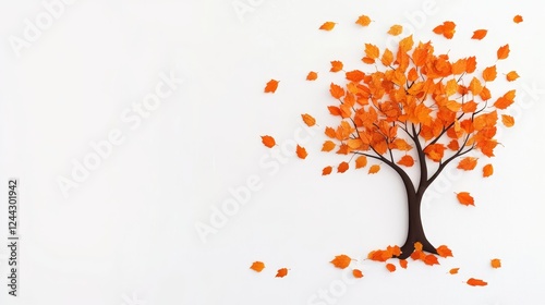 © AI Photo Stock, Fototapeta premium Autumn Tree with Falling Leaves - A stylized autumn tree with orange leaves on a white background, perfect for fall-themed designs and seasonal marketing.