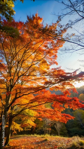 © OlgaNeuroArt, Fototapeta premium Autumn Tree with Vibrant Red and Orange Leaves at Sunrise
