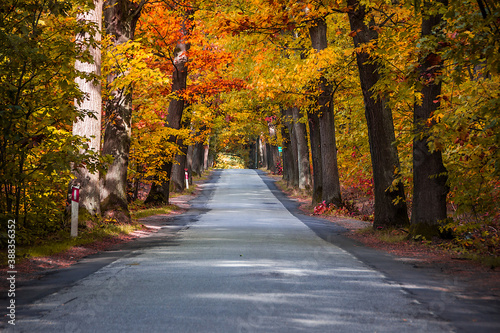 © tmag, Fototapeta premium Autumn trees alley with colorful leaves in the park