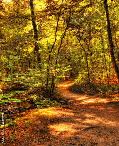 Naklejka premium Autumn, trees and forest with path in nature for eco friendly, sustainability and environment in park. Outdoor, foliage and leaves with sunshine at countryside for season, garden and woods in Canada