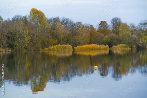 Fototapeta premium Autumn trees and reeds by lake symmetrical reflected in water
