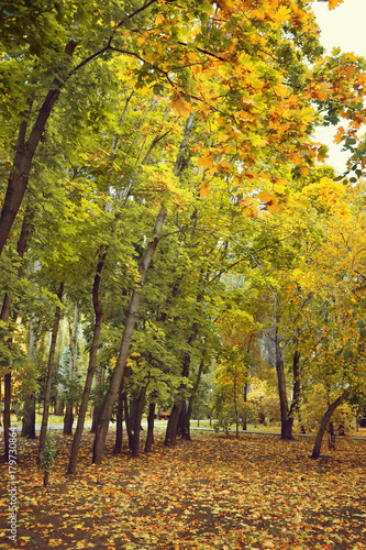 Fototapeta premium Autumn trees are Maples with yellow and Green leaves. Nature landscape. Early...