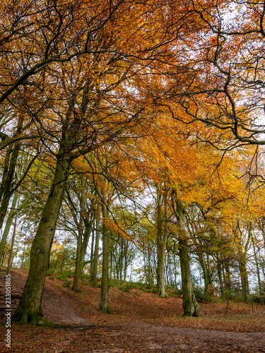 © Malcolm, Fototapeta premium autumn trees in wood with leaves on ground