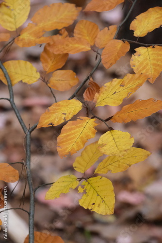 © Yevhen, Obraz premium Autumn trees in yellow forest. Park with fallen leaves on the foreground