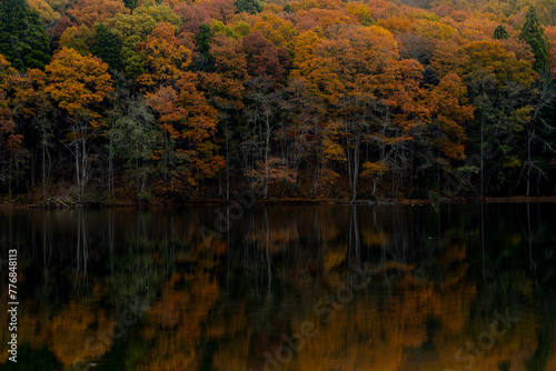 © Terence, Fototapeta premium Autumn trees reflected on a calm and placid lake in Japan on a moody overcast day