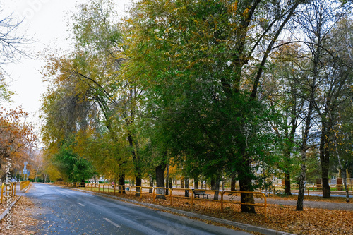 Obraz premium Autumn trees with fallen leaves. City street.