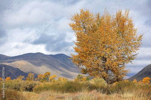 Fototapeta premium Autumn trees with nature mountain near the Khovd river at Western Mongolia