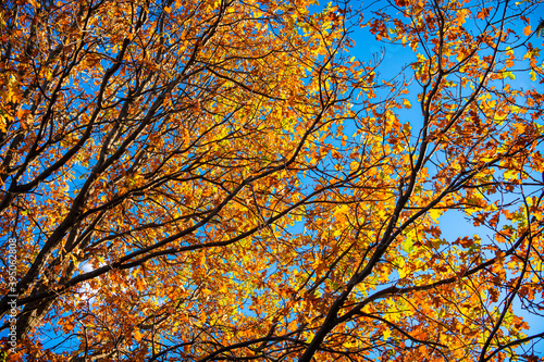 © VITALII, Fototapeta premium Autumn trees with rich yellow foliage on the edge of the lake in the Park. Autumn natural background.