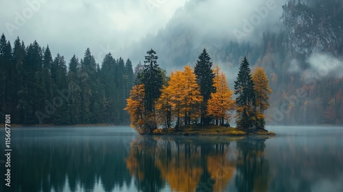 Fototapeta premium Autumn trees with vibrant colors reflecting on a tranquil lake surrounded by misty mountains in a serene morning atmosphere