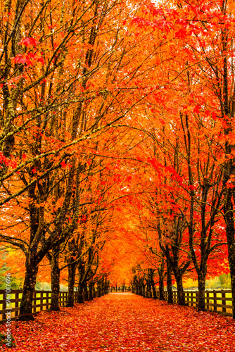 © Cavan, Fototapeta premium Autumn trees with vibrant leaves line a countryside path.