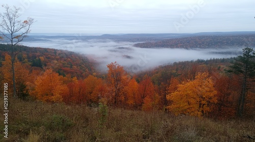 Fototapeta premium Autumn valley fog scenic overlook landscape postcard