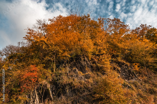 © Vit-Vit, Fototapeta premium Autumn view of the mountains. High mountains under a blue cloudy sky. Nature in the autumn forest. Beautiful mountain landscape in autumn under a blue sky. Nature in the autumn forest.