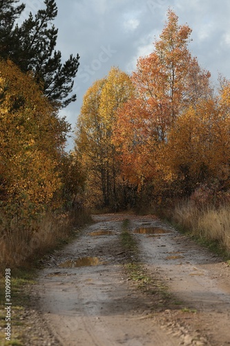 Obraz premium Autumn village trees landscape view. Autumn village scene.
