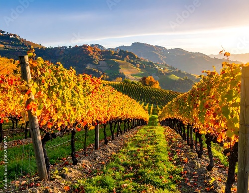 © Banyu, Naklejka premium Autumn vineyard landscape at sunrise