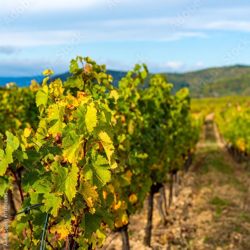 Naklejka premium Autumn vineyard rows, pale yellow-green leaves, sunlight on vines