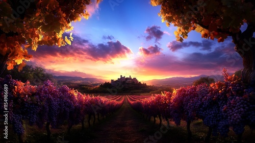 Obraz premium Autumn Vineyard Sunset with Medieval Castle in the Background