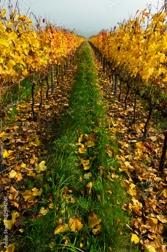 Naklejka premium autumn vineyard, yellow grape leaves at october fog