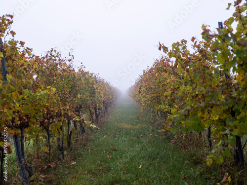© babaroga, Fototapeta premium autumn vineyards in the mist