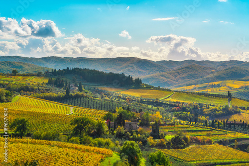© stevanzz, Fototapeta premium Autumn Vineyards Panorama in Panzano in Chianti, Tuscany
