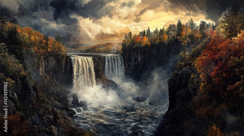 © Zeva, Fototapeta premium Autumn Waterfall Landscape Dramatic sunset over cascading falls, autumn foliage, rocky cliffs. Use Wallpaper, travel