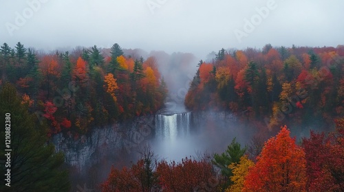 © NAIMAH, Fototapeta premium Autumn Waterfall Mist Forest Landscape, Aerial View