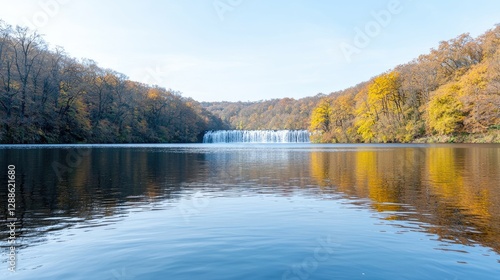 Fototapeta premium Autumn Waterfall reflecting in calm lake. Peaceful scenery. Use for nature...