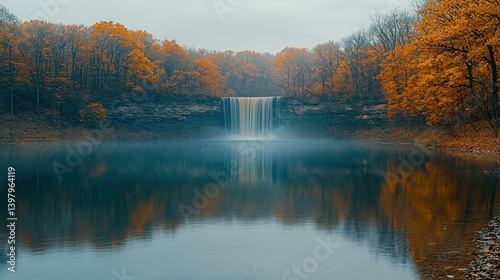 © novitasary, Naklejka premium Autumn Waterfall Reflection: A Serene Fall Scene