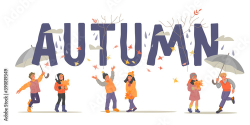 © Мария Гисина, Naklejka premium Autumn web banner or poster background with children playing with leaves and walking under umbrella, flat vector illustration. Teens boys and girls characters in front of big word Autumn.