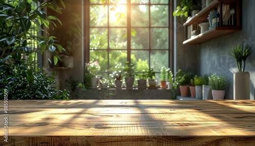 © Svetlana, Obraz premium Autumn wooden podium, table with autumn plants in the kitchen with plants, mockup for product presentation