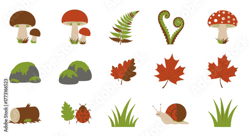 Fototapeta premium Autumn Woodland Elements Vector Set Isolated on White Background