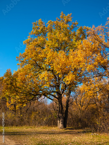 Fototapeta premium Autumn woodland landscape - Large oak tree with golden leaves at the edge of the woods near the trail