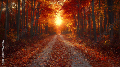 © Warakorn, Obraz premium Autumn Woodland Trail: A peaceful woodland trail covered with a mosaic of fallen leaves, bordered by tall trees in full autumn bloom, with dappled sunlight filtering through the branches, creating a