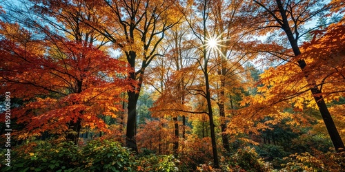 © Chaowarat, Fototapeta premium Autumn Woods. Sunlight Piercing Through Trees.