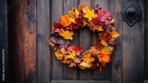 Fototapeta premium Autumn wreath hanging on a wooden door