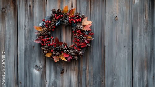 © Shobakh, Fototapeta premium Autumn wreath hanging on weathered wooden planks.