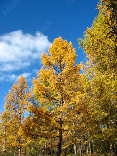 © Светлана Ильева, Fototapeta premium Autumn. Yellow larch tops against blue sky background