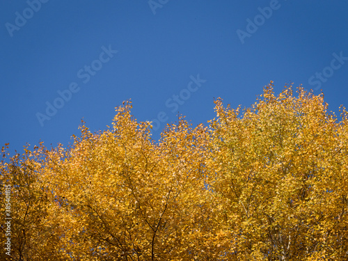 © Olga, Fototapeta premium Autumn yellow leaves on the branches of a tree against a bright blue sky.