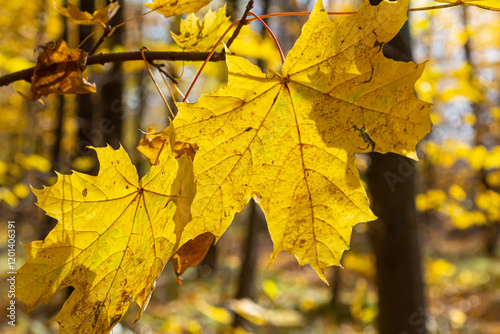 © Oleh Marchak, Obraz premium Autumn yellow maple leaf among green foliage. Early Autumn