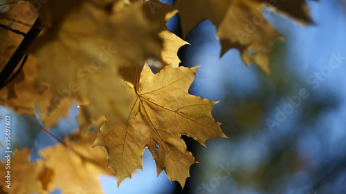 Fototapeta premium autumn yellow maple leaves on blurred background blue close-up