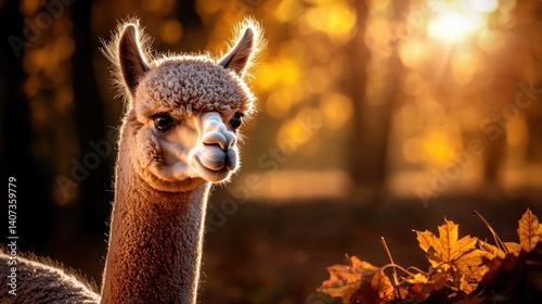 Obraz premium Autumnal Alpaca Portrait in Sunny Forest