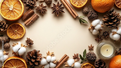 © Ta, Fototapeta premium Autumnal attributes concept, cinnamon sticks, Chinese anise, dried oranges, pinecones, cotton, acorns, leaves and candles forming an empty circle for text on a beige isolated background.