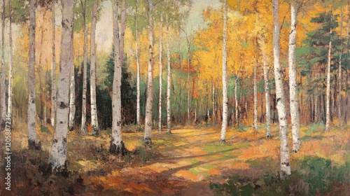 Fototapeta premium Autumnal Birch Forest Path Sunlight Dapples Through Trees