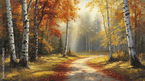 © Alfath, Fototapeta premium Autumnal birch forest pathway bathed in golden sunlight.