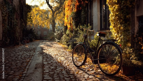 Obraz premium Autumnal cobbled street with vintage bicycle