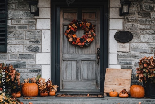 Obraz premium Autumnal Doorway Decor with Pumpkins and Wreath