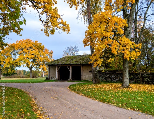 Naklejka premium Autumnal farm scene with golden foliage and rustic barn